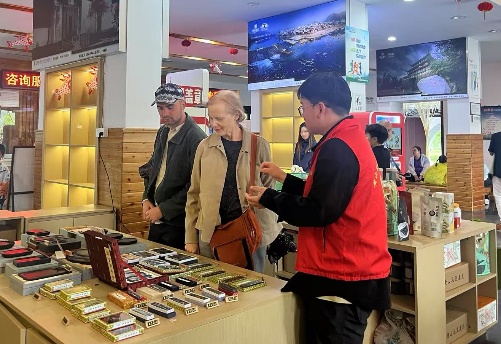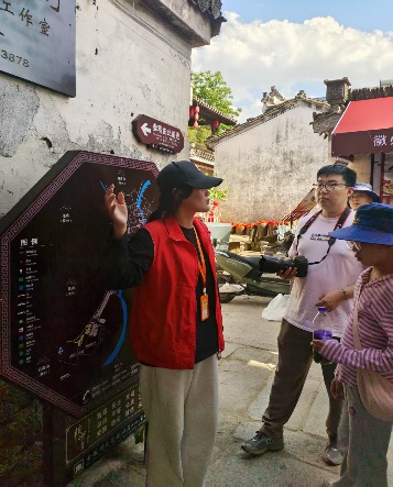活动以“语言+文旅”为核心特色,结合景区需求灵活分配任务:从服务内容来看,呈坎组的同学全员参加了景区讲解实践,服务游客104人次,得到了切实的讲解技能上的锻炼。22级英语的张超同学为3名来徽州古城游览的外国游客提供了全程英语讲解服务,展现了老员工的外语优势与跨文化交流能力,得到了游客的好评。其他景区因自有讲解员较多,或因假期外籍游客数量较少,对讲解服务的需求有限,服务重点转向引导咨询、文创销售、秩序维护等保障性工作。从服务游客数量来看,西递组的杨欣悦、于恬恬和杨玉璐均以约300人次的服务量表现突出。