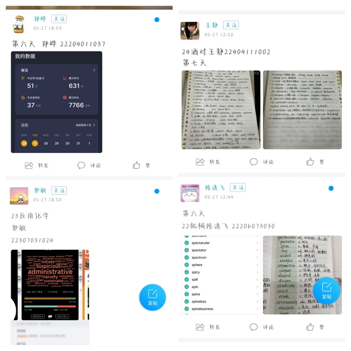 活动期间,同学们踊跃加入学习通单词打卡小组,每日在群内分享丰富的打卡内容。从学习数据的展示,到单词笔记的分享,无不体现出同学们的学习热情与自律态度,同学们的打卡截图生动呈现了多样化的学习成果,既有数字化的学习统计,也有详实的笔记记录,营造出浓厚的互助学习氛围。