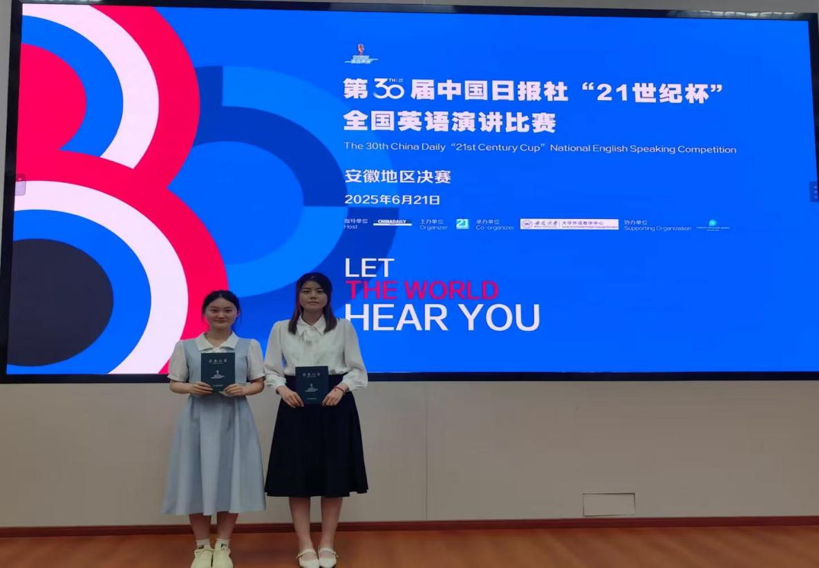 6月21日,第30届中国日报社“21世纪杯”全国英语演讲比赛安徽地区决赛在安徽大学举行。来自安徽大学、合肥工业大学、安徽师范大学等省内10多所高校的学子参加比赛。公司教育科学公司员工李慧娴、太阳成集团122ccvip员工黄慧慧在太阳成集团122ccvip教师方莉、王巧指导下,分别获得二等奖、三等奖的佳绩。