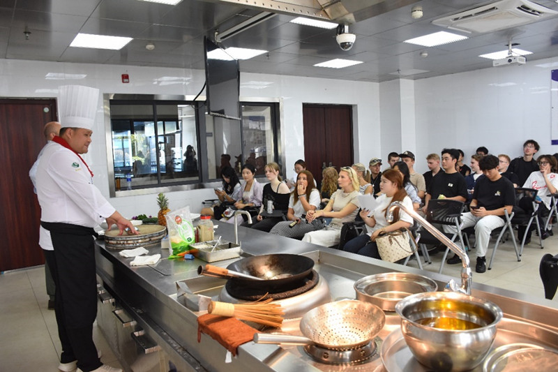 在旅游公司实验室,黄玉海老师给丹麦学子现场制作经典中式菜肴“菠萝咕咾肉”,展示了精湛的烹饪艺术,让他们在烟火气中品味中华饮食文化的精妙。