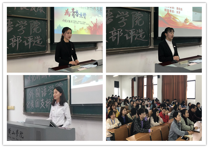 本次评选通过PPT展示各团支部风采,各团支书立足实际,分别从班子建设、特色活动开展情况、学风建设、出勤卫生情况、获奖情况、2019年工作计划六个方面进行汇报。其中,17级英语3班举办的读书交流会、“三走”活动,18英语1班的特校支教、福利院送温暖志愿服务活动,18日语班的学习互帮互助活动都得到了评委的一致好评。