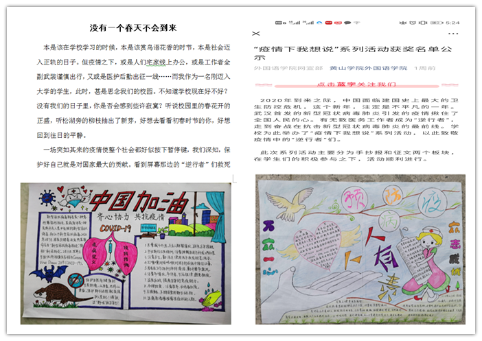 19英语3班的沈启玥同学以“没有一个春天不会到来”为主题,娓娓道来自己在这次疫情难关居家防护的心声,深情倾诉了我们身为当代老员工守护光明、共克时艰的美好愿望。18日语班的赵欣蕊同学以一副图文并茂的手抄报作品向我们描绘了一位医生母亲与孩子在这场疫情中的分离场面。