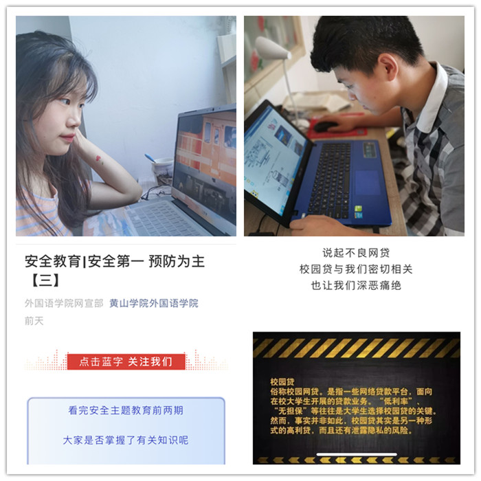 近日来该院微信公众号上发布安全主题教育系列推文,将六点安全教育知识分为户外安全和防灾减灾、不良网贷和网络诈骗、预防传销和禁毒教育三部分普及知识连续推送;同时,通过qq平台发布安全教育知识,增强员工安全意识,提高避险能力。