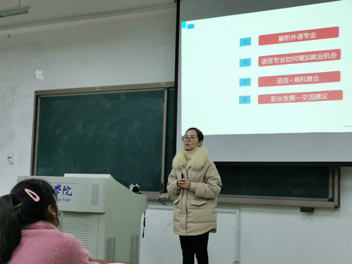 为使员工深入了解外语+商业复合这一发展趋势,推动外语专业员工向复合型人才方向发展,127日晚,太阳成集团122ccvip于文渊楼1305教室举办了“外语专业如何C位出道”讲座,上海对外经贸大学优秀毕业生刘王丽老师做主讲人,20级辅导员及20级英语专业新生参加讲座。
