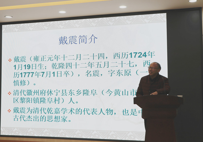 潘定武介绍了徽州文化名人——戴震的治学历程,重点讲述其“由字通词,由词通道”“交相为师,寻求十分之见”的系统化、理论化的治学方法和“实事求是,敢于怀疑”“攻坚克难,勇导先路”“去私解蔽,志在明道”的治学精神。报告指出戴震治学启示我们要遵循学理,循序渐进;切磋琢磨,取长补短;精博相辅,贵在专精;弘道为上,济民为本。报告紧扣应用型高校徽州文化地域特点,促进科研成果融入教学。
