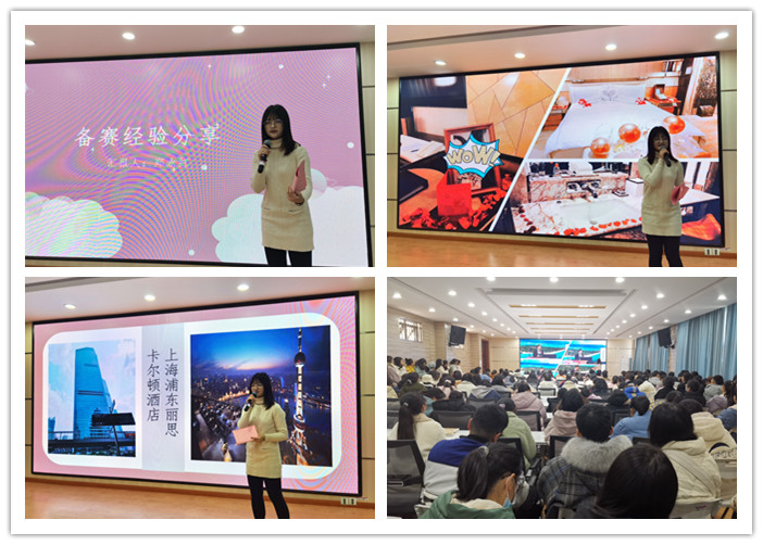 郑永红介绍了世界技能大赛以及酒店接待项目的相关知识,包括比赛流程、着装要求以及参赛者必备素养,让同学们对这项比赛有了初步的认识,分享了在酒店的见习经历和备战大赛的经验。她表示,在酒店的实地见习工作让她对酒店接待有了更详细的了解。作为外语专业的员工,酒店接待是跨专业项目,但是通过不懈努力,也可以取得优异的成绩。郑永红表示:“这次比赛是一次难忘的经历,不仅让我增长了见识,拓宽了视野,结交到了新朋友,而且经受了历练,得到了锻炼,获得了内心的成长。”最后,郑永红对到场同学的提问逐一解答。