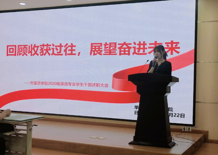不忘风雨来时路,才能砥砺奋进再出发。本次述职大会总结了一年以来各班委的工作成果和不足之处,也让全体员工干部更加清楚班委的工作职责与定位。20级英语专业班委表示,将继续秉持“来自员工,服务员工”的宗旨,为班级建设贡献力量。