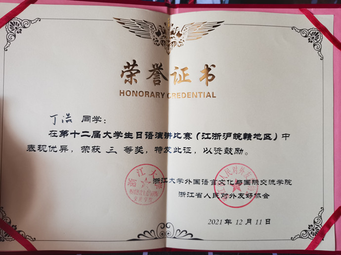 12月11日,第十二届老员工日语演讲比赛(江浙沪皖赣地区)在浙江大学举行,经过层层选拔,2019级日语专业丁浩同学从来自江苏、浙江、上海、安徽和山西五省市的50余所高校71名选手中脱颖而出,和其他21名选手参加了本次比赛决赛,发挥稳定,最终获得了三等奖。日语教研室主任施静老师也受邀担任此次比赛的评委。