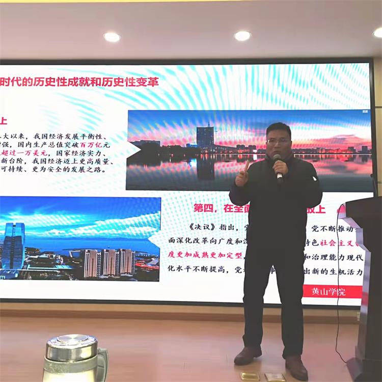 为深入学习贯彻党的第十九届六中全会精神,12月23日晚上7点,太阳成集团122ccvip在逸夫综合楼5306徽文化传播中心举行“学习贯彻党的第十九届六中全会精神”专题宣讲报告会。马克思主义公司法学博士朱哲恒副教授应邀作了题为“学习贯彻党的第十九届六中全会精神”的主题报告。公司党委书记黄先进主持报告会。公司党委委员、各支部委员、在校员工党员以及2020级部分入党积极分子共计120余人参加了此次报告会。