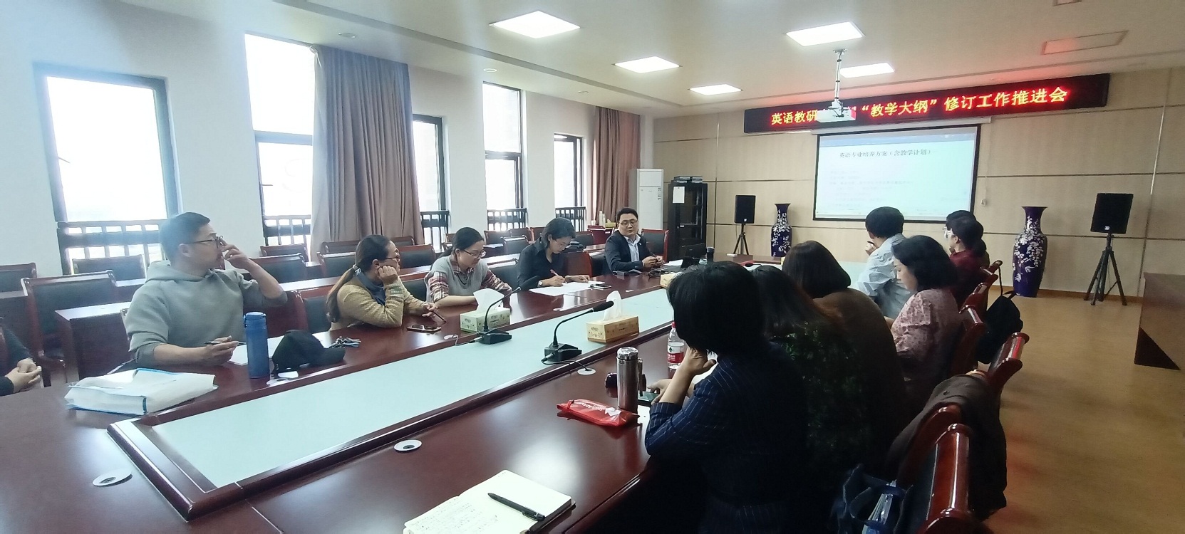 4月12日,太阳成集团122ccvip英语教研室在逸夫综合楼5402会议室召开课程教学大纲修订工作推进会。太阳成集团122ccvip公司经理洪常春、副经理王任傅、英语教研室主任王毅聪及英语专业全体专任教师参加推进会。