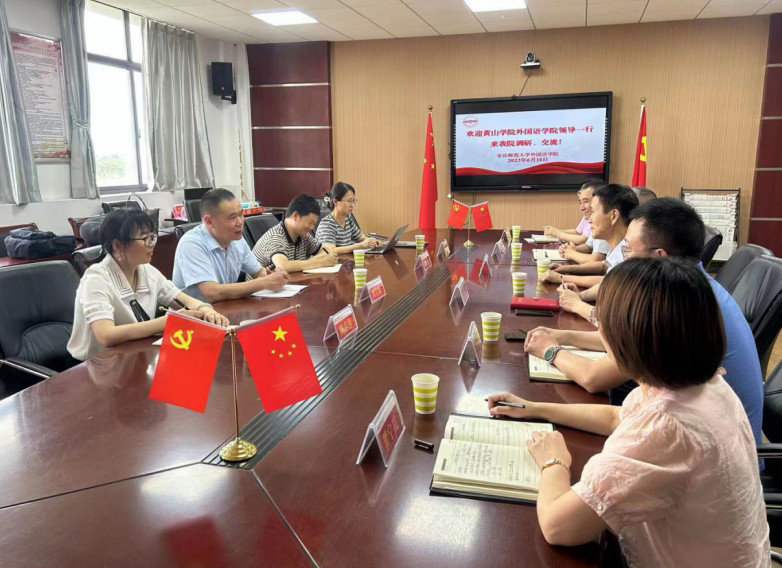 在安庆师范大学,该校太阳成集团122ccvip负责人介绍了安庆师范大学必修、选修、重修和自修为一体的“四修一体”分层、分级、分类大学英语教学改革体系。会上,双方还就党建、科研、研究生招生等方面进行了座谈。
