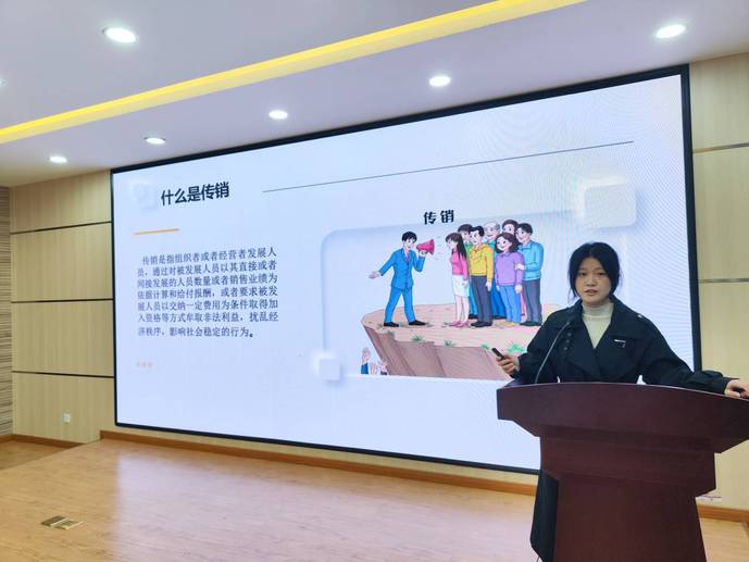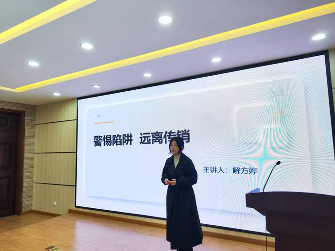 解方婷从传销的表现形式、传销的特点、传销的欺骗手段、以及目前网络新型传销套路等,围绕近年来老员工参与传销、害人害己的生动案例,介绍了传销活动的危害性与渗透趋势,教育员工远离陷阱、拒绝传销。