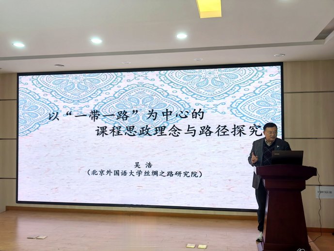 会上,吴浩作了题为《以“一带一路”为中心的课程思政理念与研究路径探究》的报告。首先,吴浩简要介绍了“一带一路”倡议的主要内容。接着,他通过政策沟通、设施联通、贸易畅通、资金融通、民心相通等帮助听众了解中国与“一带一路”沿线国家的互联互通水平。然后,吴浩结合多年来的研究经历与成果,以“丝绸之路观”的视域,从丝绸之路历史观、地理观、经济观、文化观四个维度,向观众分享了丝绸之路的古今中西及其未来,详细讲述了丝绸之路开辟以来中外民族友好交往、文明互学互鉴的历史进程。