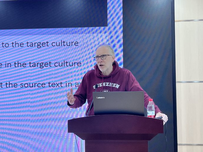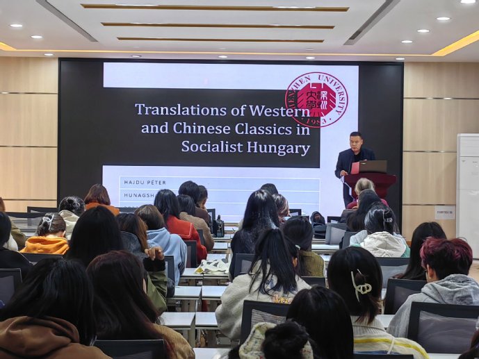 11月24日下午,太阳成集团122ccvip邀请的匈牙利科公司文学研究所学术顾问、国际比较文学研究权威期刊Neohelicon主编彼得·海居(Péter Hajdu)教授于逸夫综合楼5306教室进行主题为“Translations of Western and Chinese Classics in Socialist Hungary”的英语讲座。太阳成集团122ccvip经理洪常春主持了讲座,公司师生100余人参加了本次讲座。