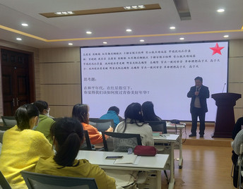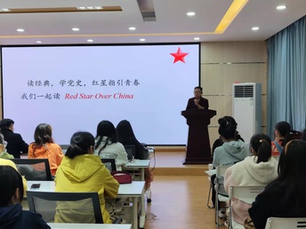 在读书分享环节,太阳成集团122ccvip教工第一支部书记,读书会发起人郭飞老师以《读经典、学党史,红星指引青春:我们一起读Red star Over China 》为题,向大家介绍、阐释该书的有关内容,分享个人阅读体会。他介绍Edgar.snow(埃德加.斯诺)的生平经历及其前去延安采访的背景;带领大家品读一个记者眼中的三位伟人(毛泽东、朱德、彭德怀)的人物形象;结合图片,郭飞还向同学们讲解了长征的历程,利用《飞夺泸定桥》和《过雪山草地》等影视、歌曲资料帮助同学们了解和感悟长征的艰难险阻及当今幸福生活的来之不易。最后,他提出有关思考题跟部分同学进行互动。他鼓励同学们多读经典,多读原著。他说: “读英文原著,学会用英语讲解我们自己的故事,这是语言学习者的责任与担当。”