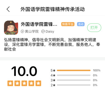 此次活动通过让同学们在易喵喵上发布参加雷锋志愿服务活动的心得体会,引导同学们学习雷锋同志的先进事迹,弘扬雷锋精神,传递青春正能量。易班网络空间热议雷锋精神活动引起了同学们的广泛关注,共有195人报名参加此活动,评论获赞近千次。