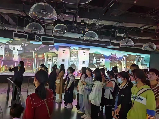 在黄山市城市展示馆,同学们体验了国内唯一的CAVE720度全景体验剧场“梦立方”, 站立于悬浮廊桥上,跨越时空、穿梭天地,从黄山到齐云山再到牯牛降,从新安江到太平湖再到古村落,时而在徽州的石板街巷感受明清商业市井,时而在山泉鸟鸣中回归自然本态。