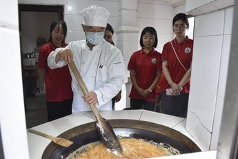 6月26日,“向日葵”实践宣讲团走进沈先时糖坊,体验制糖全过程。灌芯糖的制作过程复杂而繁琐,涵盖了发酵、熬糖、拉白、灌芯等近十道工序,每一道工序对技术的要求都极为严格。必须选用优质糯米煮成糯米饭,然后配上等比例的麦芽进行均匀搅拌,在适宜的温度下进行发酵。熬糖的步骤也至关重要,火候、时间、温度都必须恰到好处,首先要大火,然后逐渐转为文火,整个过程需要不停地搅拌糖水。接着,将糖稀倒在木钩上,两手握住糖稀,不断地上下拉动,一抖一转一拉,刚柔相济,深棕色的糖浆在双手的不断拉动下逐渐变成清澈的白色。最后,把早已炒制、打碎好的白芝麻芯料像包饺子一样倒进糖团里,慢慢捏合糖团封口,趁热倒上米粉、反复搓拉,拉出长长的一条后再将其分成一根根等长的灌芯糖,在进行分盒包装,这样灌芯糖就制作完成了。