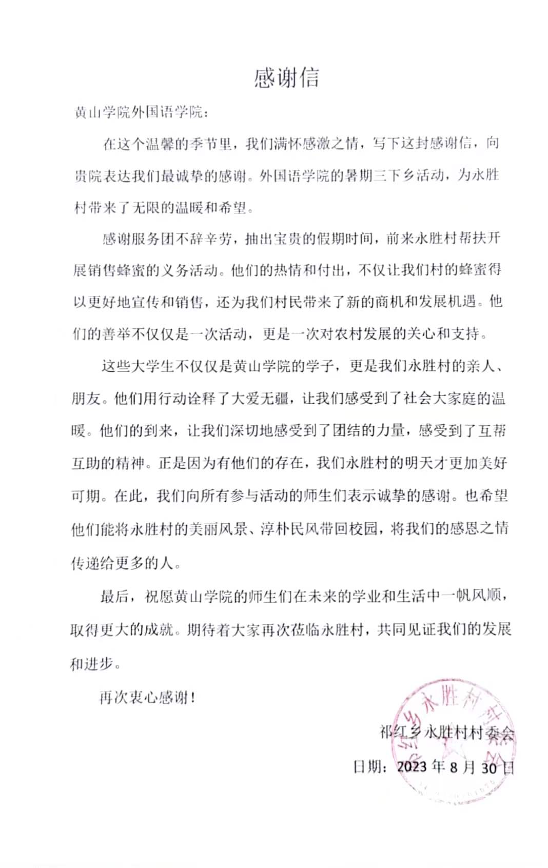 近日,祁红乡永胜村给公司发来感谢信,对公司永益农皖南红色乡村振兴服务团开展蜂蜜义卖活动期间的热情与付出表示感谢。信中指出,服务团主要协助永胜村进行蜂蜜的宣传和销售,不仅拓展了永胜蜜的销售渠道,也为当地带来了新的商业机会。感谢信同时对公司在此次暑期三下乡工作上的大力支持表示感谢。