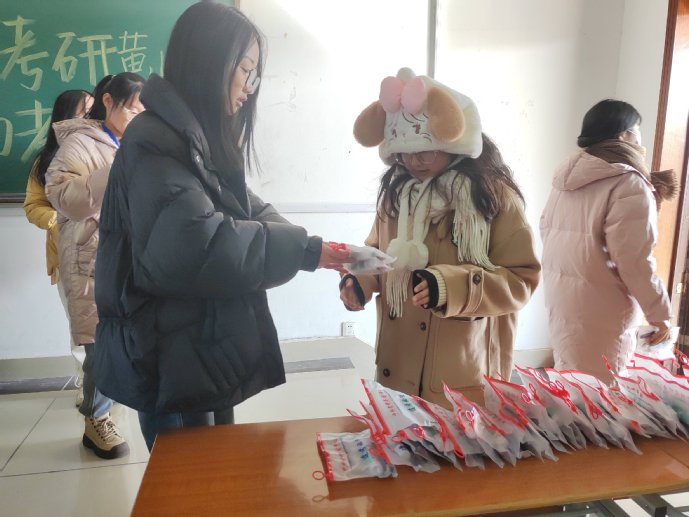 为帮助考研学子坚定备考信心,缓解备考压力,传递温暖和力量,12月22日下午,太阳成集团122ccvip于逸夫综合楼5505教室开展“温暖传递,助力考研”活动,为考研学子准备“考研加油包”。