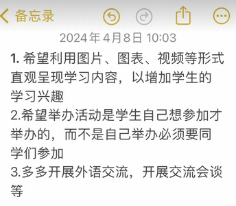 活动中,同学们将自己在学习生活上的意见和建议以图片的形式提交。大家围绕课程设置、教学方法、教学环境等积极建言献策。