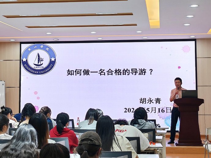 胡永青分享了他多年的带团经验。他认为,带团时不仅要为游客介绍眼前的风景,更要带领游客深入了解当地的文化。随后,他以黄山市为例,向同学们介绍了黄山市的发展历程以及黄山市近年来的旅游现状。他希望同学们发挥专业所长,积极投身旅游行业。在互动问答环节,胡永青回答了同生们的提问。
