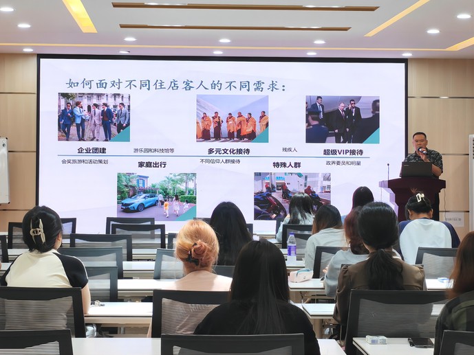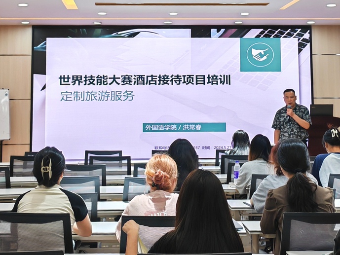 洪常春以定制旅游为主题,围绕游客需求和定制服务、定制旅游产品设计、旅游接待服务三个方面展开详细说明。他介绍了酒店接待比赛的规定,分享了优秀参赛选手的事例。与此同时,他强调在酒店接待比赛中书面英语和口语表达能力的重要性,希望同学们保持端正的学习态度,持续学习,提高自己的专业能力。