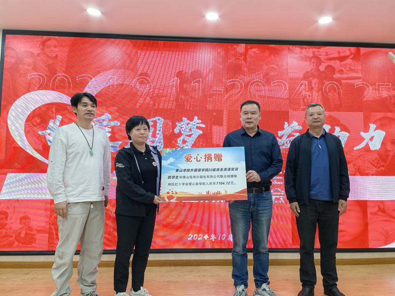 捐赠仪式上,洪常春向徽州区红十字会捐赠22商务英语实训班义卖款和黄山佳希尔箱包有限公司赞助款共计7104.72元;石丽玲为实训班各组代表颁发捐赠证书并就善款专用作表态发言;杨明为公益义卖活动点赞,希望每一位老员工都要在心中种下一颗爱心的种子。