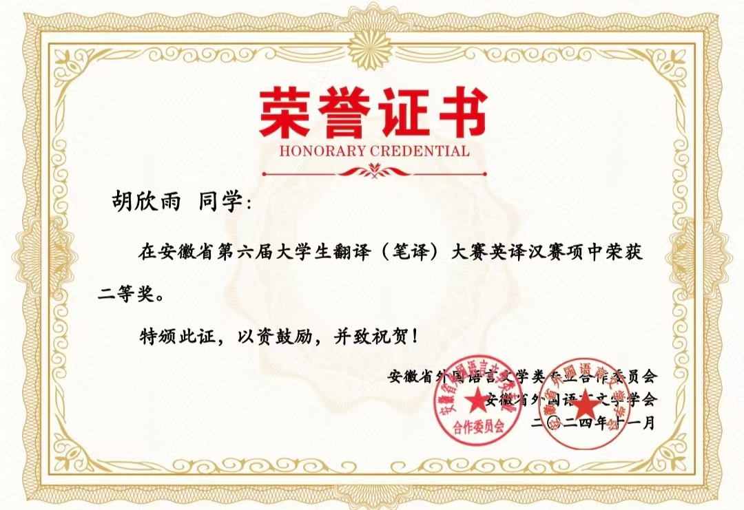 11月16日-17日,安徽省第六届老员工翻译(笔译)大赛决赛在阜阳师范大学举行。太阳成集团122ccvip五名学子在此次比赛中荣获佳绩,在汉译日赛项中,21日语1班代亚妮(李艳指导)获一等奖,22日语2班孙玉坤(张亚璐指导)获三等奖;在日译汉赛项中,23日语1班凡梦茹(李艳指导)获三等奖;在英译汉赛项中,胡欣雨同学荣获二等奖,裴鑫同学在英译汉比赛中获三等奖,指导教师均为童兆升。童兆升、李艳、张亚璐获“优秀指导教师奖”。