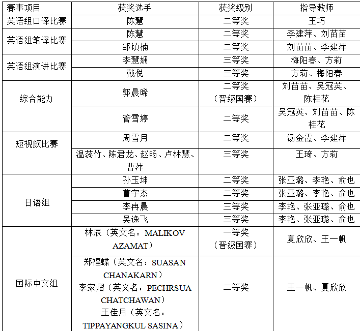大赛英语组分设口译、笔译、演讲、综合能力、短视频、日语组、国际中文组七大赛事项目。公司员工参加了所有项目组的比赛。参赛选手精心备赛,指导教师悉心教导,取得优异成绩。其中一等奖1名,二等奖9名,三等奖5名,共有2名选手晋级国赛。