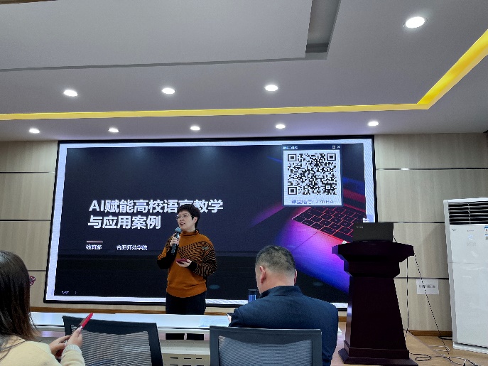 随后,钱莉娜作了主题为”AI赋能高校语言教学与应用案例”的专题讲座。讲座中,她详细介绍了AI的定义与分类,并通过实际案例展示了二者在教学场景中的广泛应用。一般智能AI如讯飞FIF口语系统用于员工语音评测与反馈;雨课堂、学习通等助力学习数据分析与评估,生成式 AI 则在设计教学素材、情景对话与创意任务方面大显身手。她指出,生成式 AI 在个性化学习中的应用令人瞩目,可以为员工定制学习路径、推荐智能内容、提供实时反馈并自适应调整练习难度,真正实现因材施教。针对教学中的痛点问题,钱莉娜还提出了涵盖课前、课中、课后的创新设计思路,为语言教学的优化提供了新方向。