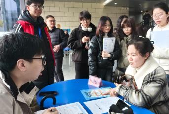 双选会现场,现场秩序良好、气氛热烈。毕业生全方位了解各企业的基本情况、招聘岗位及要求,并就招聘简历渠道、工作内容、工作环境、未来发展等方面与企业负责人进行交流沟通,寻找心仪的岗位,确定意向后,现场在逸夫综合楼专业教室参加面试。